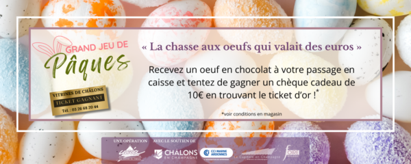 Du 29 mars au 3 avril, Vos commerçants fêtent Pâques et vous offrent pendant toute la semaine, un œuf en chocolat de la chocolaterie BROISSON lors de votre passage en caisse. Certains œufs contiennent un ticket gagnant à échanger contre un chèque cadeau de 20€ !